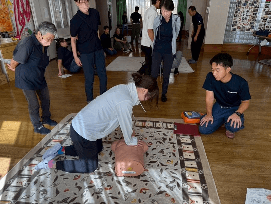 この度、職員対象に救命講習を実施し、AEⅮ(自動体外式徐細動機)の使い方や心肺蘇生について学びました。