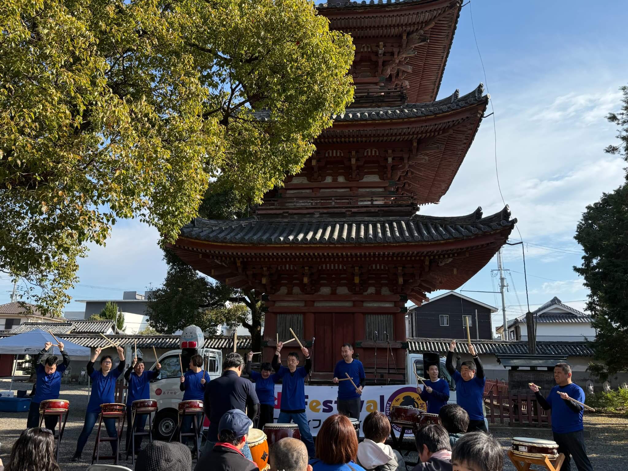 三重塔を背に迫力ある演奏を披露し、観客の皆様から温かい拍手をいただきました。利用者の皆さんも笑顔で楽しんでいました。