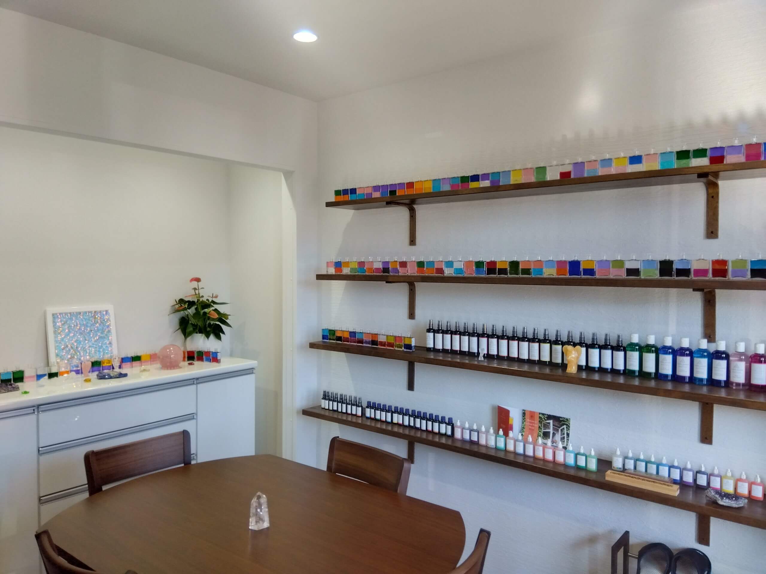 室内には、色とりどりのボトルが美しく並んでいます。これらは「オーラソーマ」と呼ばれる色・香り・植物・クリスタルなどのエネルギーを使って心と魂のバランスを整えるカラーセラピーです。