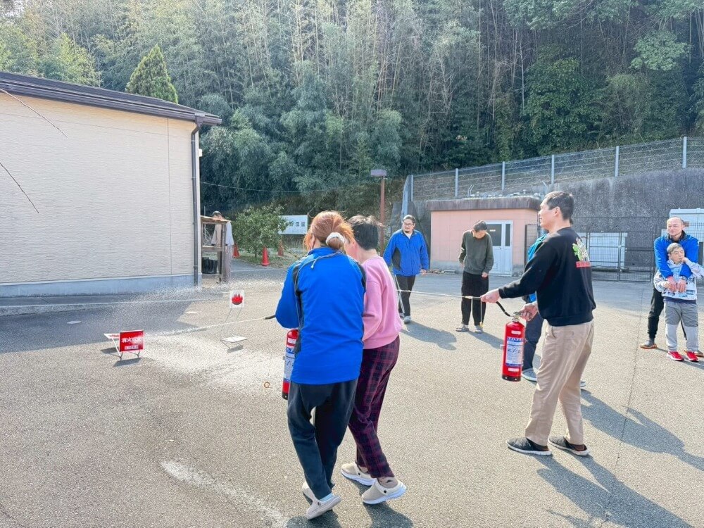 今回は消防訓練の為、最後に水消火器を使用した消火体験も行いました。実際に手に取り操作することで、初期消火の大切さや手順を具体的に学ぶことができました。